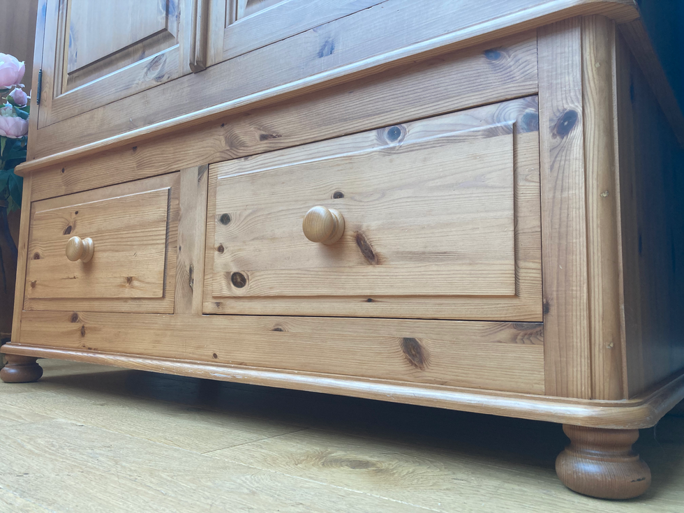 Victorian styled with a carved sunflower on the pelmet, and sitting on lovely ‘bun’ feet! This beauty is solid pine throughout and has 2 useful deep drawers with dovetail joints, pine drawer bottoms and pine backing. Absolutely stunning pine, such high quality and with a full width hanging rail and pine unit backing!