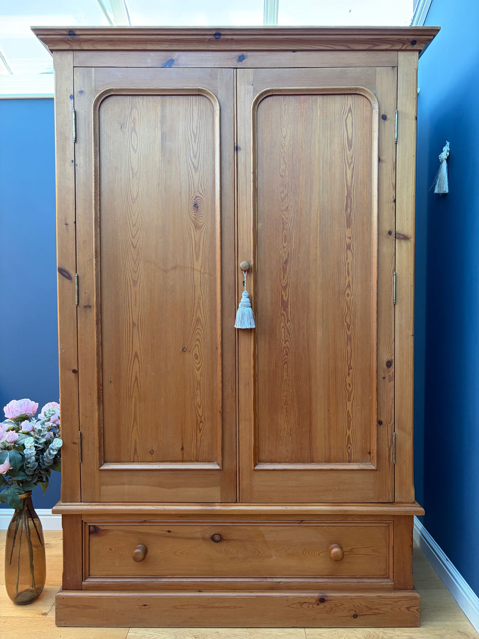 This beauty has a useful large drawer with dovetail joints, pine drawer bottom and pine backing. Absolutely stunning pine with full width hanging rail!