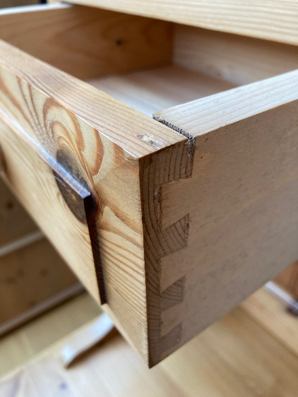 This beauty is solid pine throughout and has great storage space with 7 drawers with dovetail joints, pine drawer bottom and pine backing plus a full width shelf on the base unit and pine unit backing! Three cupboards in the base unit and a gorgeous scroll design along the bottom at the front!