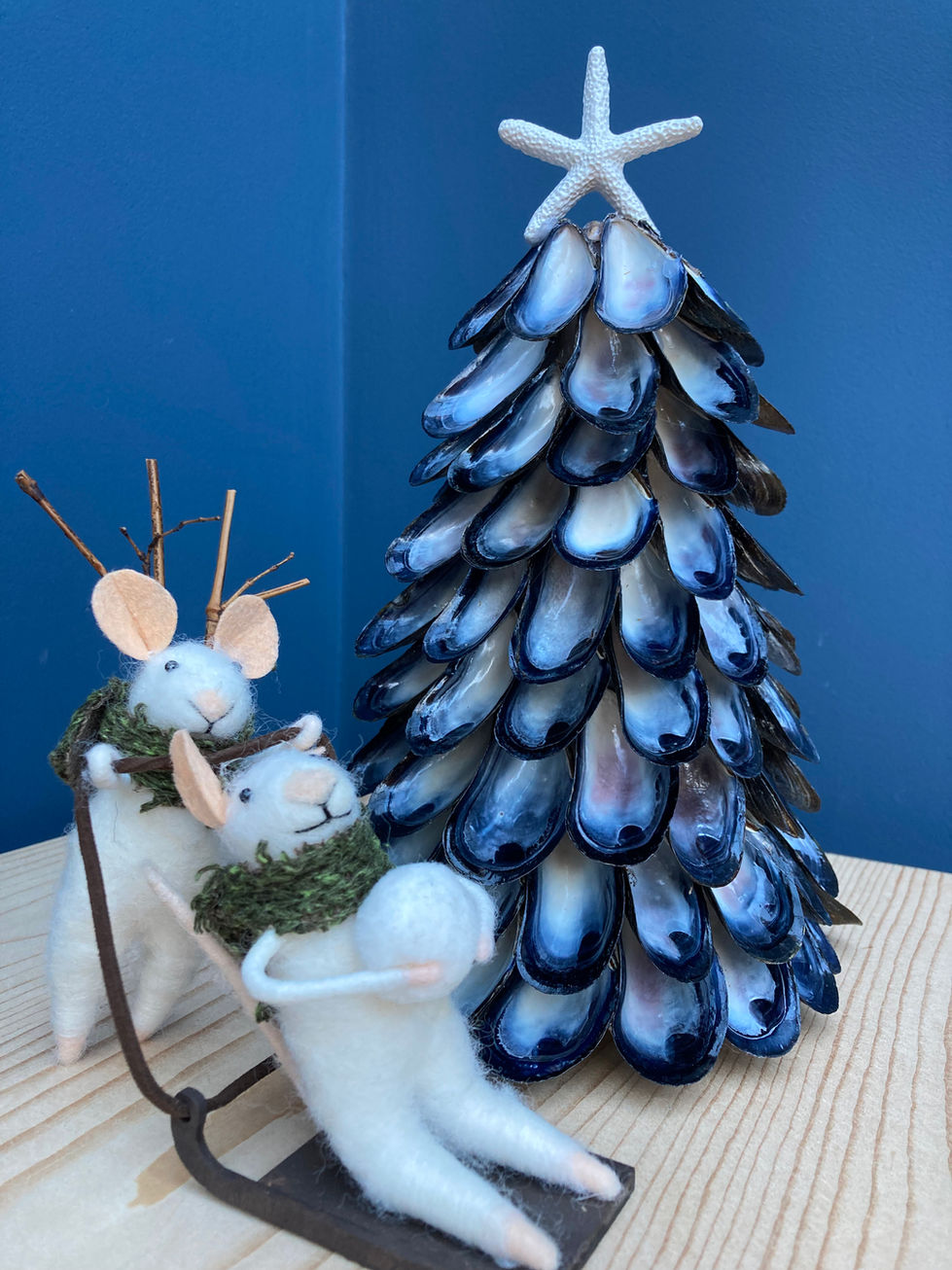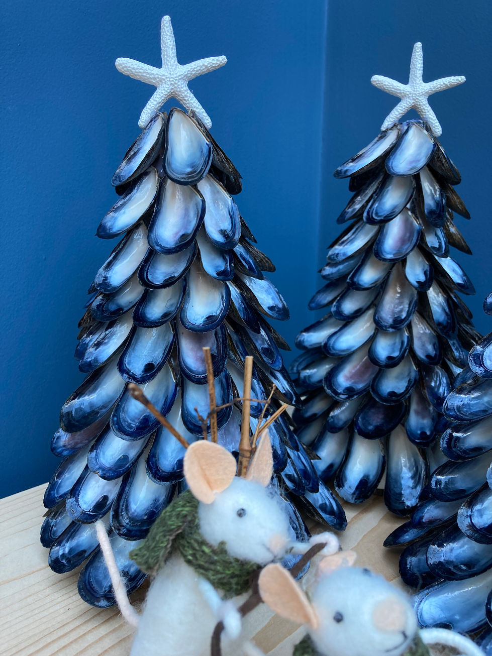Gorgeous North Norfolk mussel shell tree approximately 28cm tall with a starfish (resin) on the top! The shells are varnished to give a super glossy look! Perfect to add coastal charm to your home or holiday cottage all year round and especially at Christmas time! These make gorgeous centrepieces for tables too!