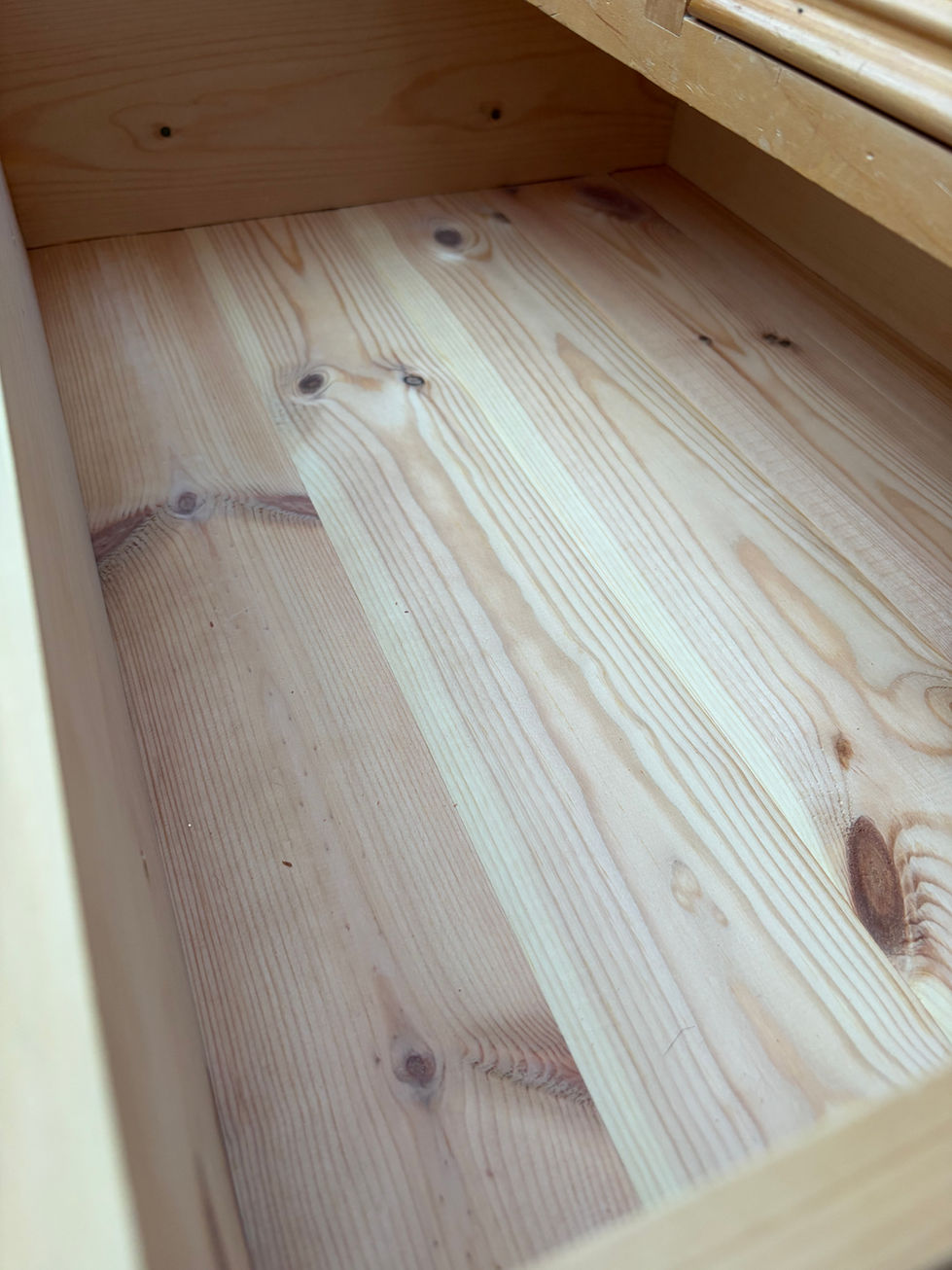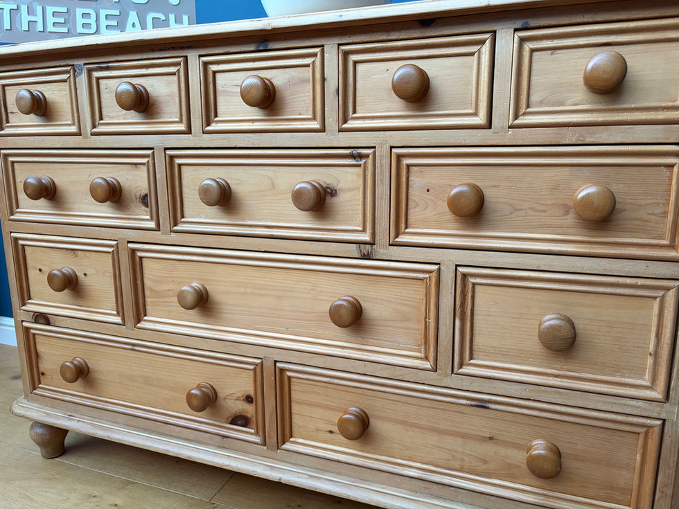 This beauty is solid pine throughout and has great storage space: the 13 deep drawers have dovetail joints, pine drawer bottoms and pine backing! The whole unit sits on lovely ‘tulip’ styled feet.